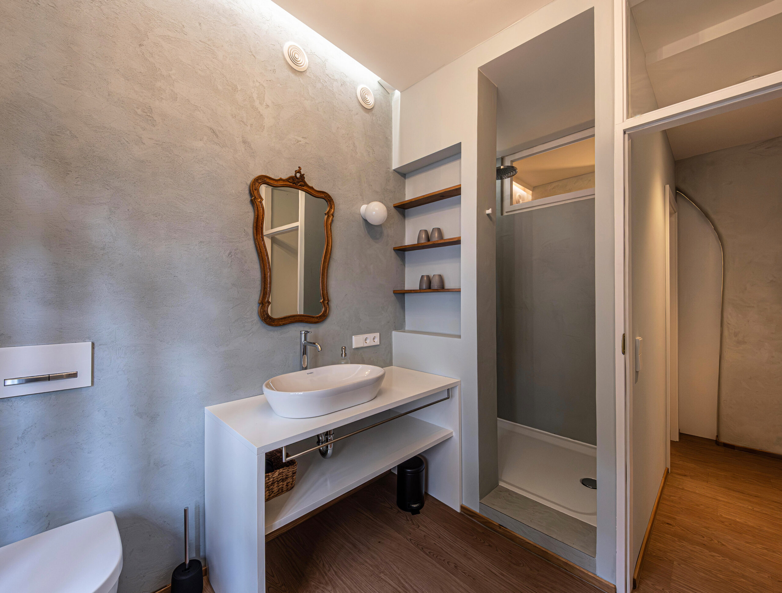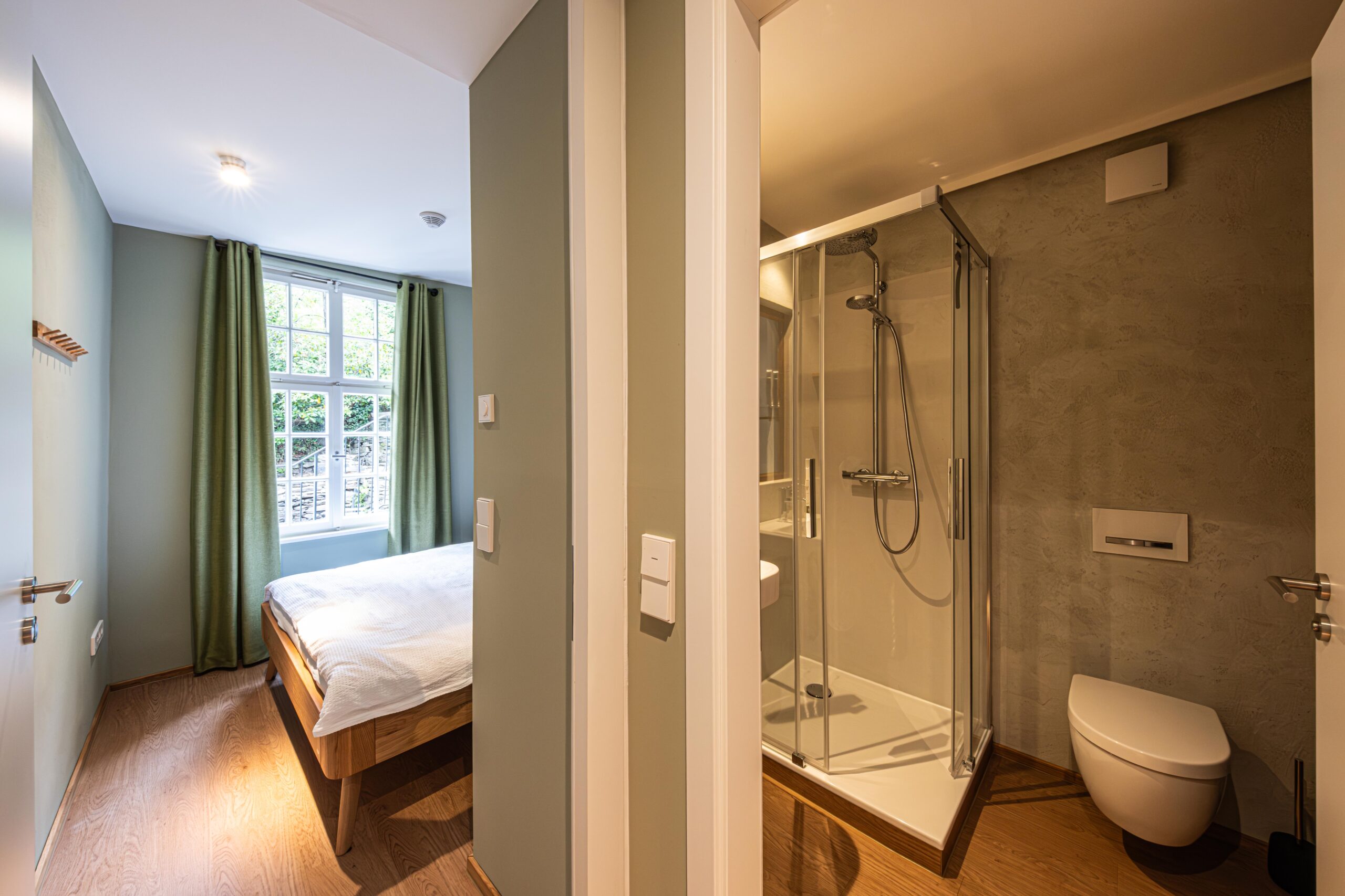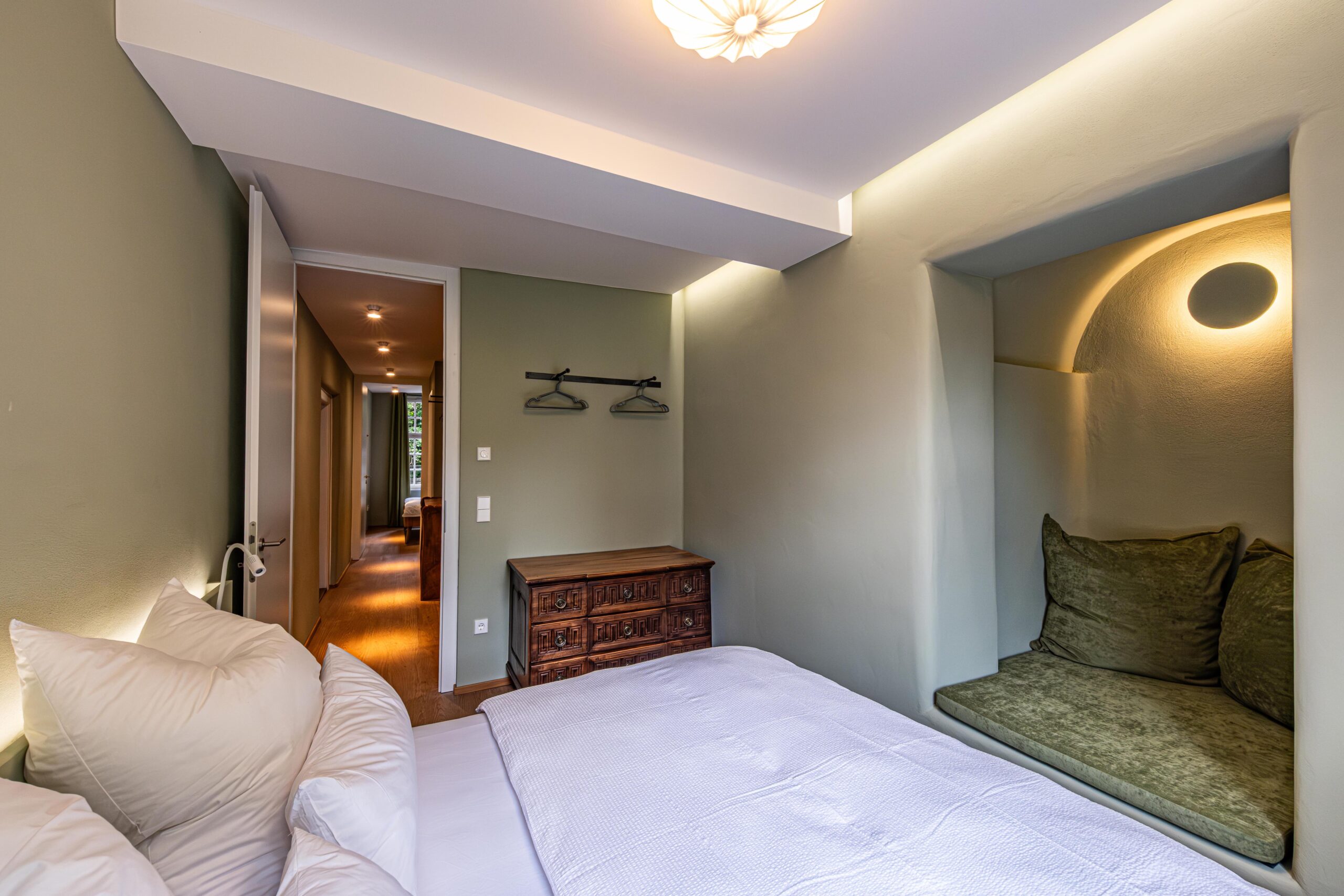 Schlafraum 2 mit Doppelbett (180×200 cm) und beheizter, historischer Wandnische. Schlafraum 3 mit Doppelbett (160×200 cm) und angrenzendem Bad mit Regendusche und WC.