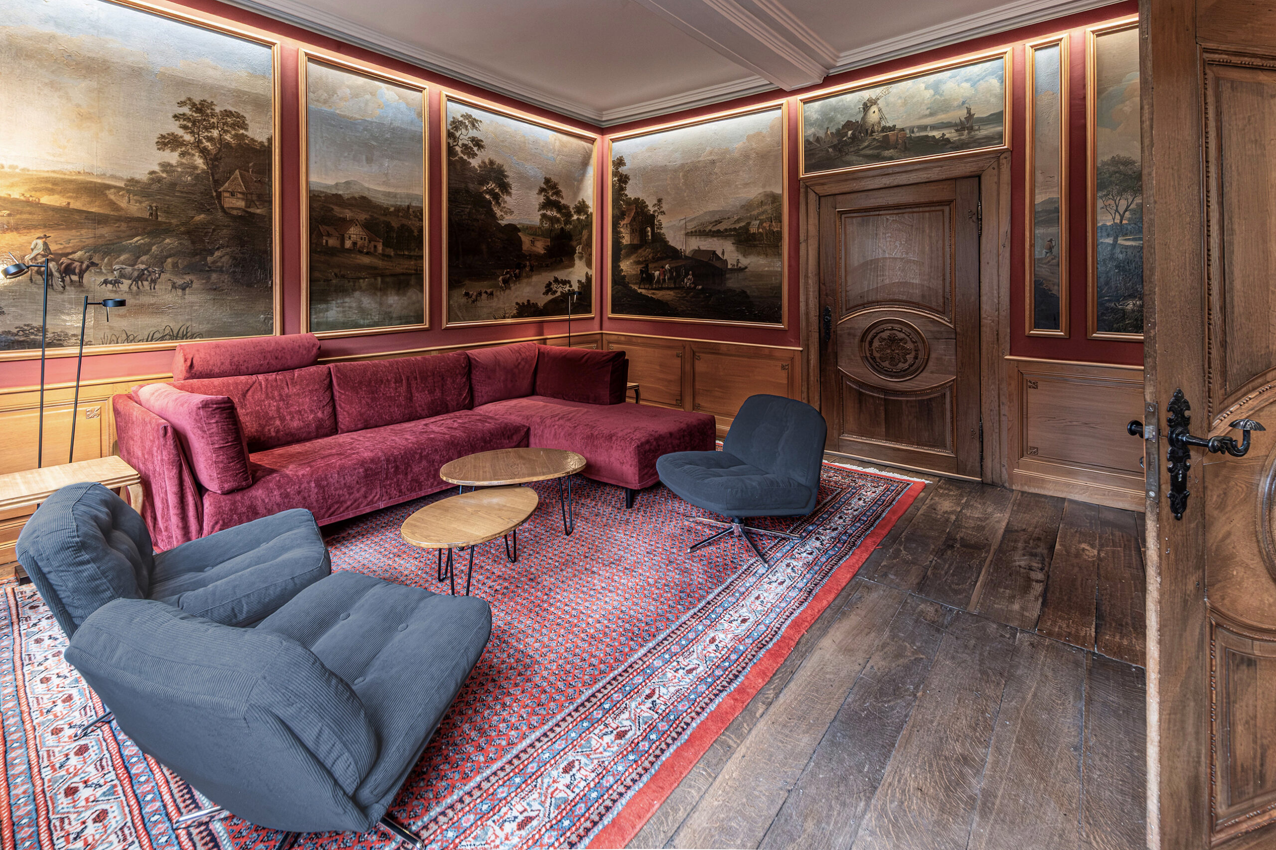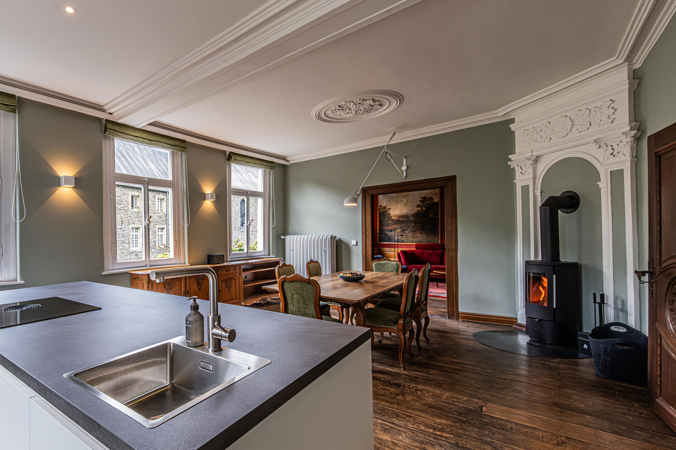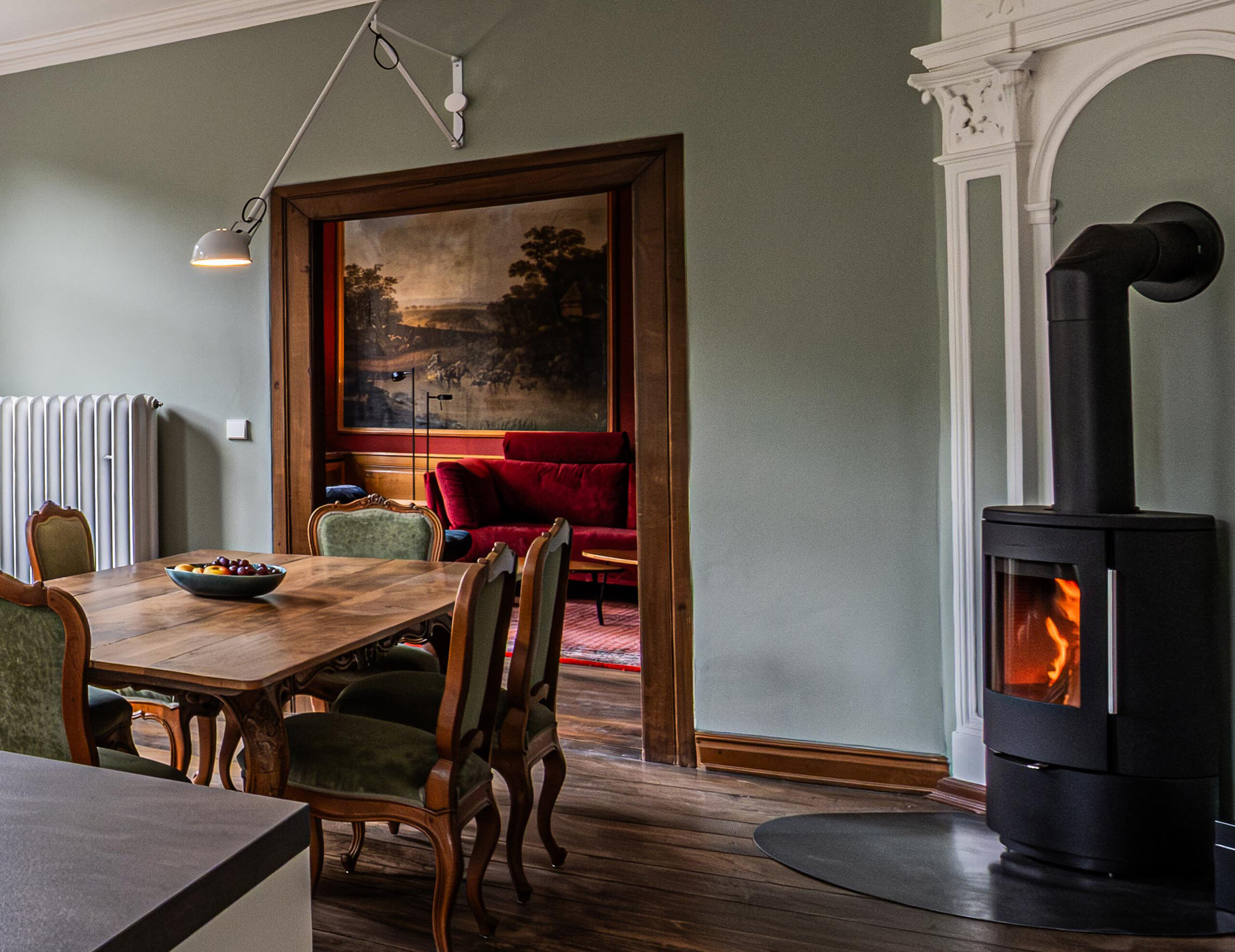 Eingangsebene im 1.OG, der „Belle Etage“, mit Diele, großzügigem Wohn- Essbereich mit Kaminofen sowie offener, voll ausgestatteter Wohnküche mit Kochinsel. Wohnzimmer mit Originalgemälden aus dem 18. Jahrhundert.