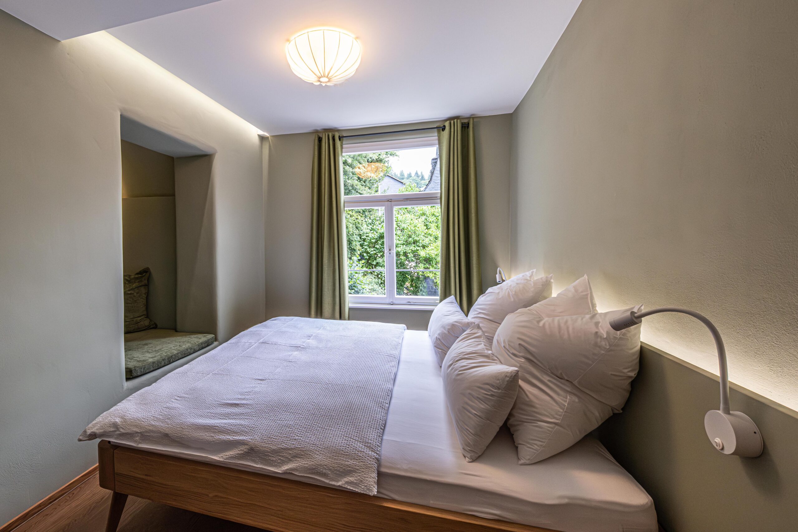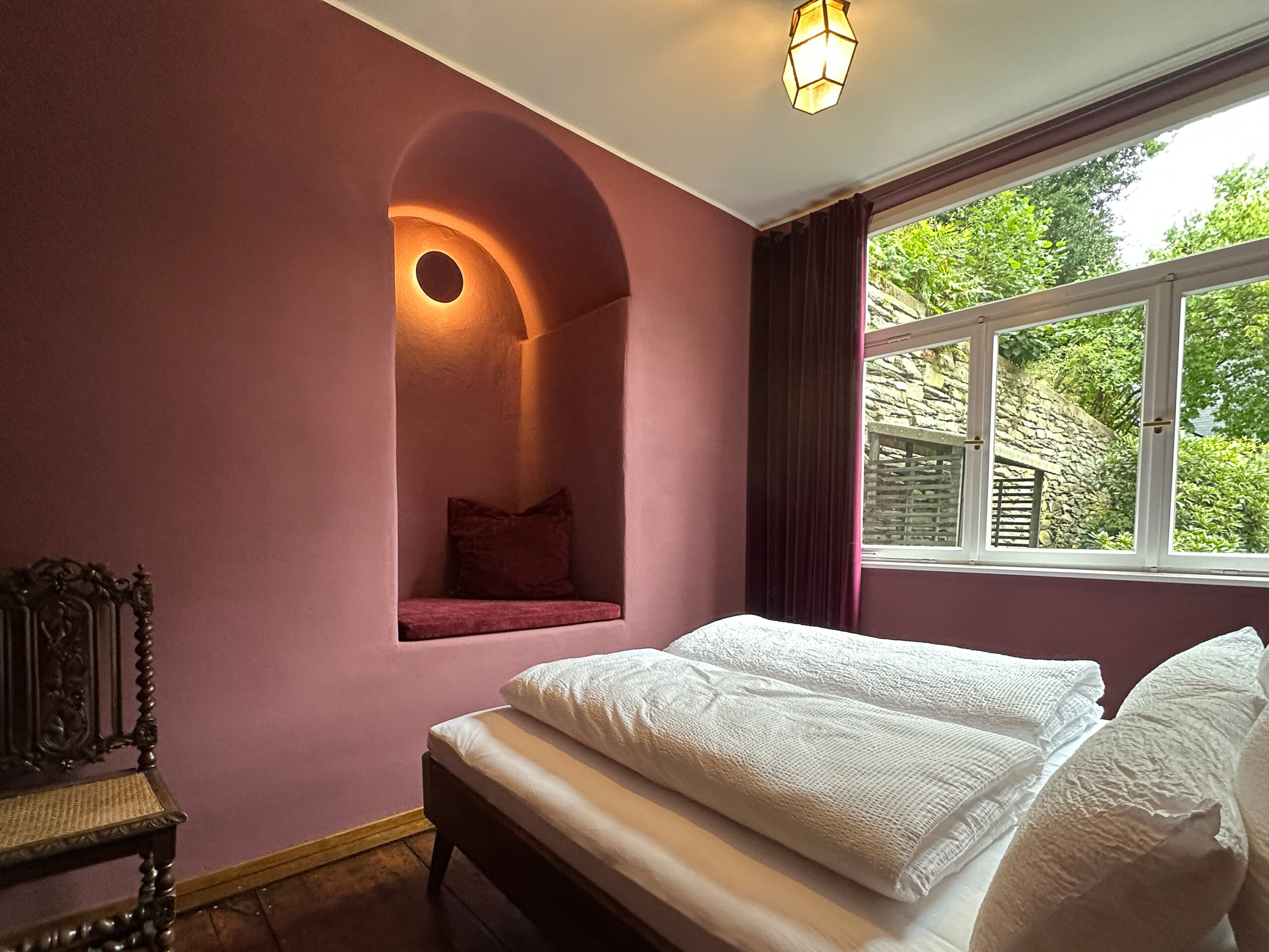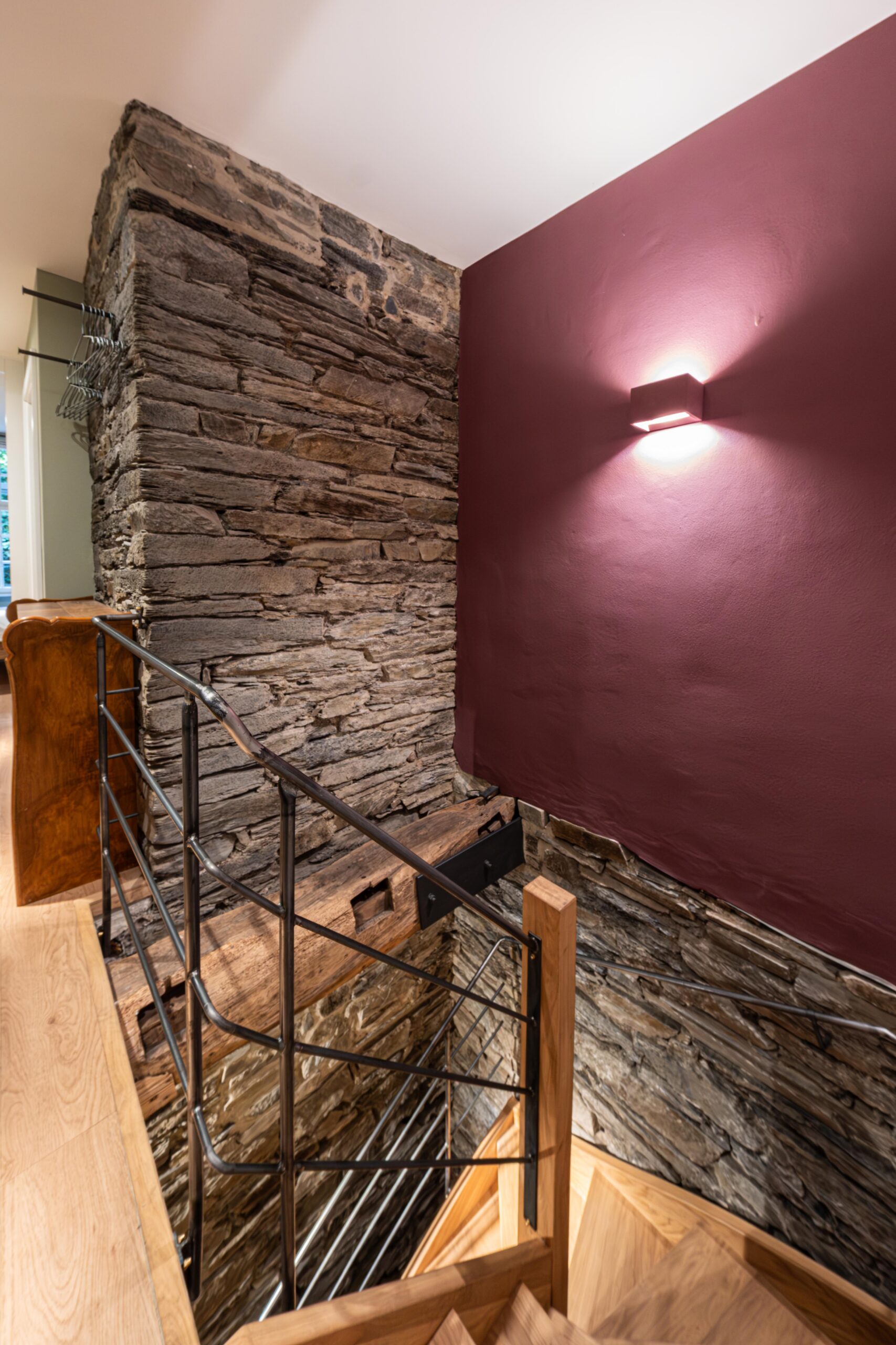 Altes Bruchsteinmauerwerk haben wir wieder sichtbar gemacht und in Szene gesetzt. Hochwertiges Lichtdesign macht jeden einzelnen Raum zusätzlich besonders. Der historische Eichendielenboden wurde von vielen Schichten Material befreit, aufgearbeitet und kann nun wieder in altem, neuen Glanz strahlen. Die Zeitreise bietet 3 separate Schlafzimmer mit jeweils einem Doppelbett, 2 Bädern inkl. WC und einem zusätzlichen, abschließbaren WC mit Waschbecken. Über eine neue halbgewendelte, innen liegende Eichentreppe gelangt ihr in den oberen Schlaf- und Badbereich.