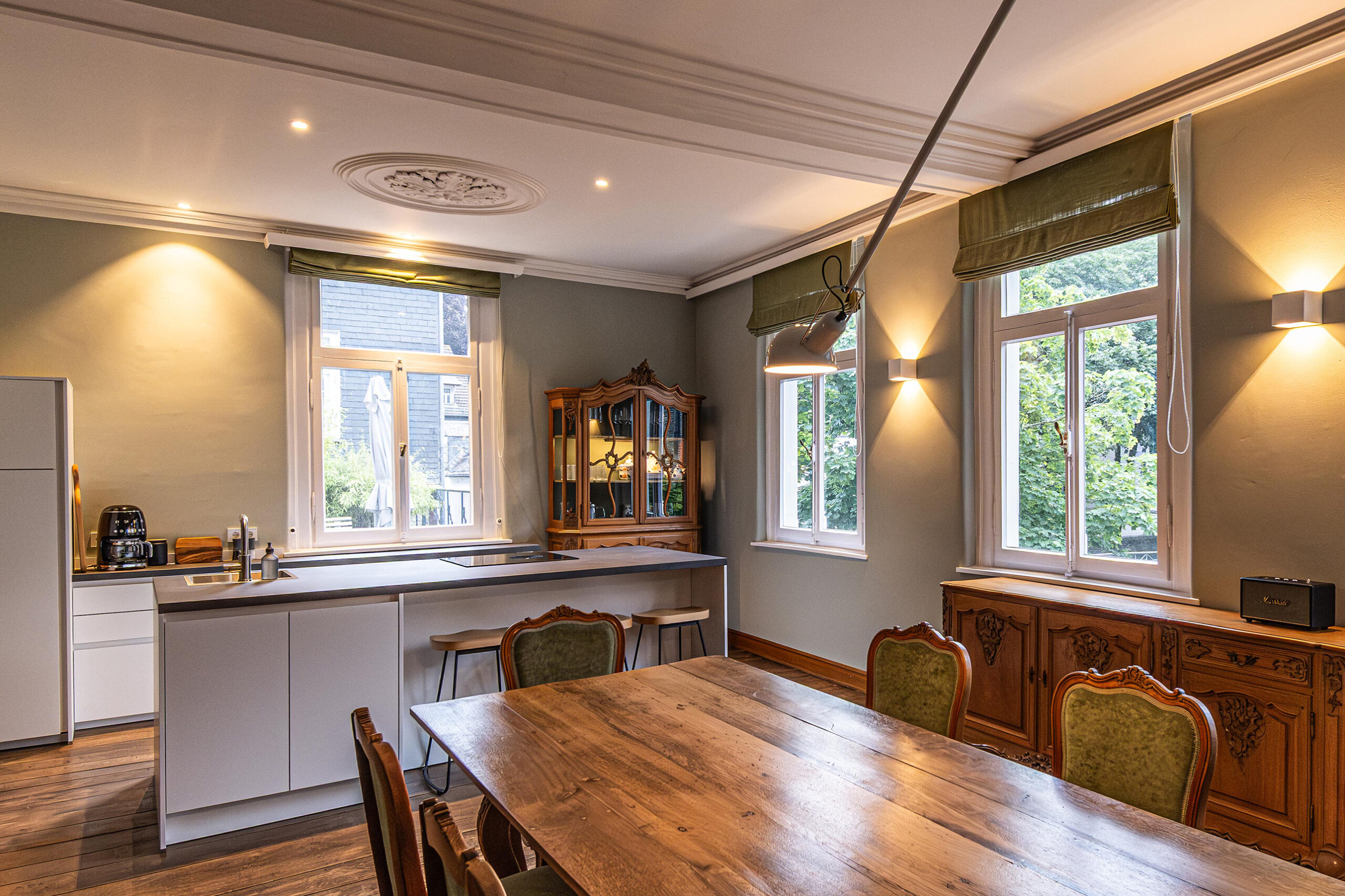 Die „Belle Etage“ der Villa. Hier erfährst du auf 130 qm Wohnfläche auf zwei Ebenen tatsächlich eine Zeitreise durch die fast 250 Jahre alte Baugeschichte des Hauses. Du wechselst die Räume durch mächtige historische Eichenholztüren, bewunderst die Stuckelemente an den hohen Decken, studierst die Originalgemälde im Wohnzimmer, lässt dich von den alten Gussheizkörpern wohlig umwärmen während zur gleichen Zeit in der modernen, voll ausgestatteten Küche gekocht werden kann. Ein zusätzlicher Kaminofen wirkt ergänzend als Wärmequelle und schafft eine wunderschöne Raumatmosphäre. In der Zeitreise finden bis zu sechs Personen großzügigen Platz. In zwei Schlafzimmern findet ihr historische Wandnischen, welche seinerzeit als Kühlschränke dienten. Hier wurden Speisen und Getränke hineingestellt und durch die kalte Bruchsteinwand gekühlt. Heute dienen diese Nischen einem anderen Zweck, werden mittels Wandheizung temperiert und bieten einen idealen Rückzugsort zum Relaxen.